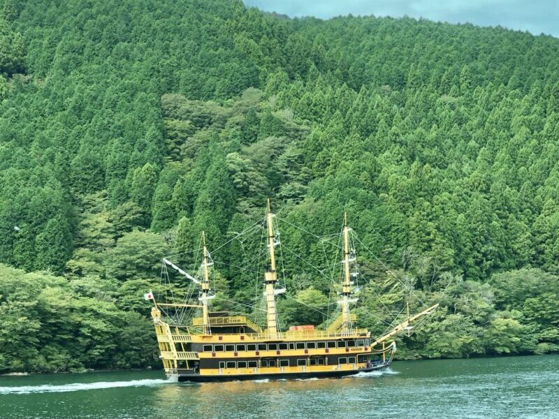 桃源台に向かうロープウェイから見える景色は足元にエメラルド色のに輝く「芦ノ湖」の湖面が見えてきます。芦ノ湖湖面上に海賊船が優雅に進んでいる景色が見えます。